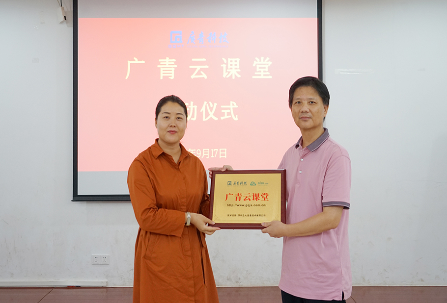 王丽向大家简要介绍了深圳企大互联网教育的相关情况,并为企业如何利用好网络在线学习平台作了经验分享。在授牌仪式上,王丽代表深圳企大公司为广青科技授予“广青云课堂”牌匾,江华革代表公司接过牌匾。