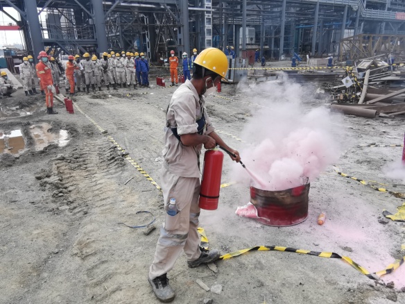 4月3日16时,印尼纬达贝工业园区8*250MW火力发电厂1号机组施工现场,一场中印尼员工联合消防演练正在上演。本次演练由安环部组织,都市环保总包单位和发电事业部中印尼员工参加,主要包括消防知识宣贯、手提式灭火器实战灭火、消防水带实战灭火等演练内容。