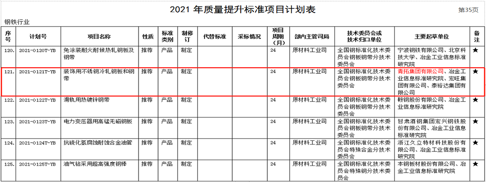 3月2日,工业和信息化部批准了2021年第一批行业标准制修订计划。其中青拓集团有限公司牵头或参与了2021-0121T-YB《装饰用不锈钢冷轧钢板和钢带》、2021-0355T-YB《铬-锰-镍-氮系奥氏体不锈钢热轧钢板和钢带》和2021-0356T-YB《铬-锰-镍-氮系奥氏体不锈钢冷轧钢板和钢带》等三个行业标准,标准中涵盖了QN系五大产品。